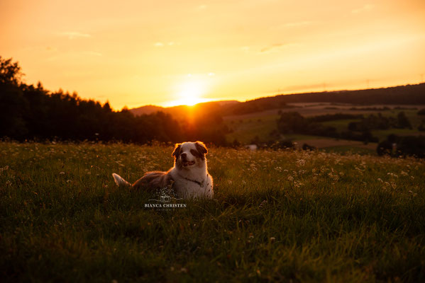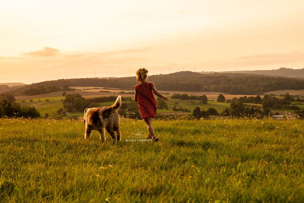 Wenn ein kleines Mädchen mit ihrem Hund durch die Wiese tanzt und der Sonnenuntergang alles in ein zauberhaftes Licht taucht.